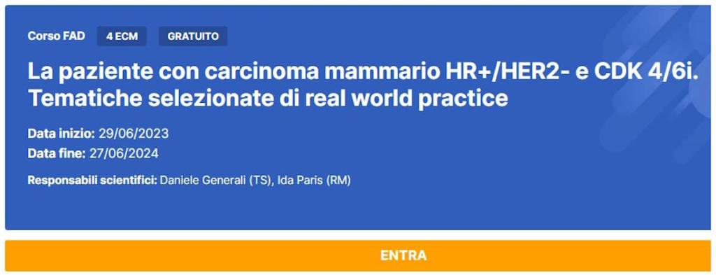 Il corso FAD ECM dal titolo "La paziente con carcinoma mammario HR+/HER2- e CDK 4/6i. Tematiche selezionate di real world practice" è accreditato ECM per infermieri e altre professioni sanitarie e consente di acquisire 4 crediti.