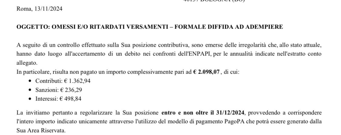 Nell'immagine sotto il caso reale di un collega che ha ricevuto, poco prima della scadenza dei 5 anni, la comunicazione del versamento da fare.