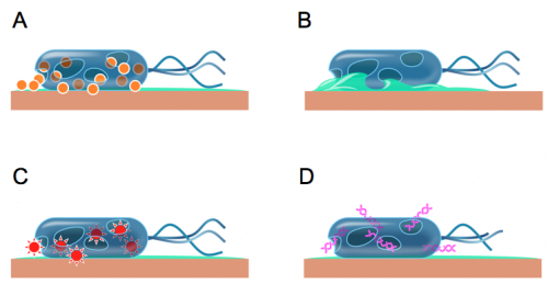 Figura 2 Rappresentazione schematica dell'uccisione per contatto. Gli ioni di rame emessi dalla superficie dell'oggetto in rame causano un danno alla cellula (A), le rotture della membrana cellulare determinano la dispersione del contenuto cellulare (B), gli ioni di rame determinano la generazione di radicali tossici che causano ulteriori danni (C) e la distruzione del DNA (D). Tratto da scienza in rete LINK.
