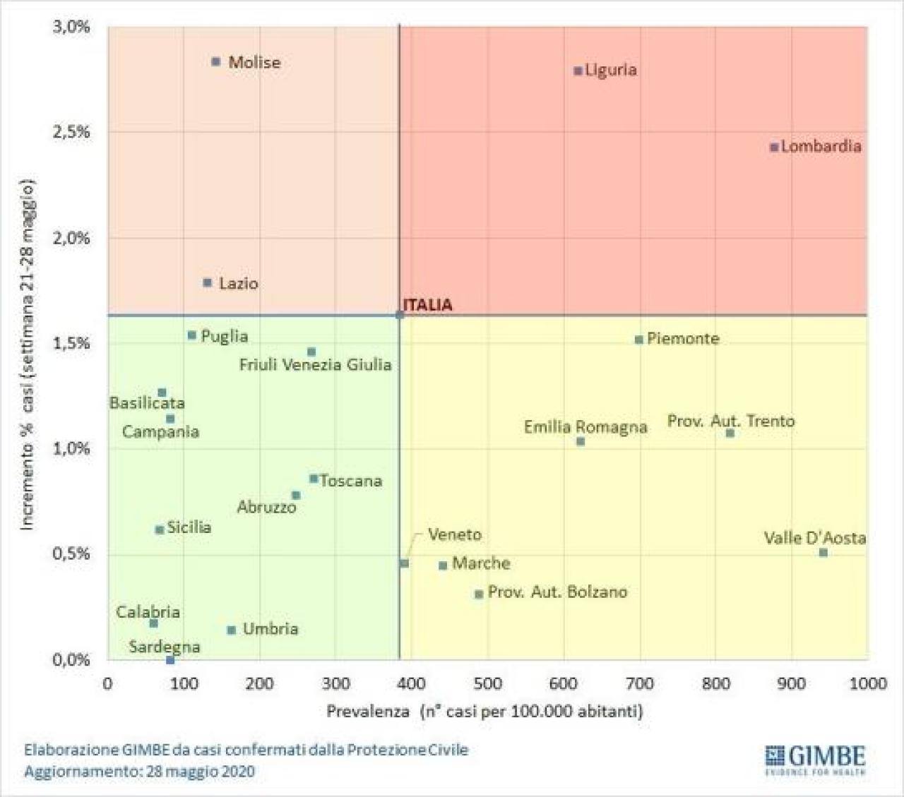 Il grafico illustra il posizionamento delle Regioni in relazione alle medie nazionali di prevalenza e incremento percentuale dei casi (settimana 22 - 28 maggio) (fonte GIMBE)