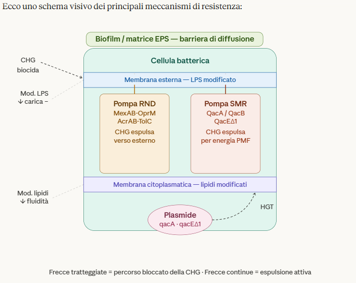 Il meccanismo più documentato e clinicamente rilevante è l'iperattivazione di pompe di efflusso transmembranarie, che espellono attivamente la CHG prima che raggiunga una concentrazione intracellulare battericida.