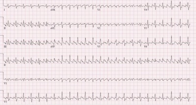 Fibrillazione atriale: per lo più irregolare, nessuna evidenza di attività atriale organizzata nell'elettrocardiogramma, assenza di onde P
