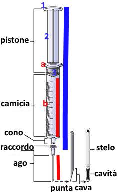 La siringa ha un cono da dove fuoriesce la soluzione che abbiamo preparato e su di esso viene montato un cono leggermente più grande, che ha una forma favorente la presa e nella parte apicale possono essere montate cannule di dimensioni differenti o aghi di diverso tipo e calibro.