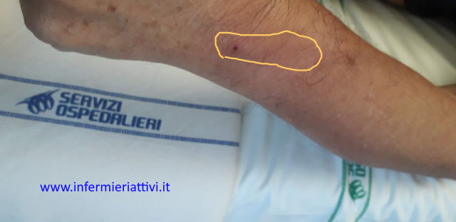 La foto sotto è una flebite nel polso "piccola" è arrossata per pochi cm la rimozione della cannula ha tolto lo stimolo ed il rischio di una progressione con i movimenti quotidiani.