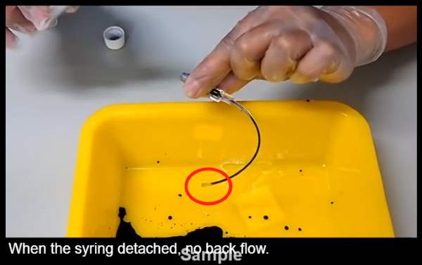 La deconnessione dal tappino, causa inevitabilmente lo spostamento della membrana che si sposta e se prima consentiva il flusso, nel suo spostamento la guarnizione va a chiudere il raccordo luer-lock, ma nel suo movimento sposta un volume minimo che richiama un reflusso ematico all'interno del CVC.