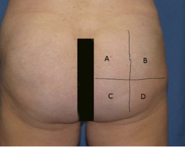 Da 5 a 7,5 cm sotto la cresta iliaca sul quadrante esterno superiore del quadrante esterno superiore all'interno dei glutei.
