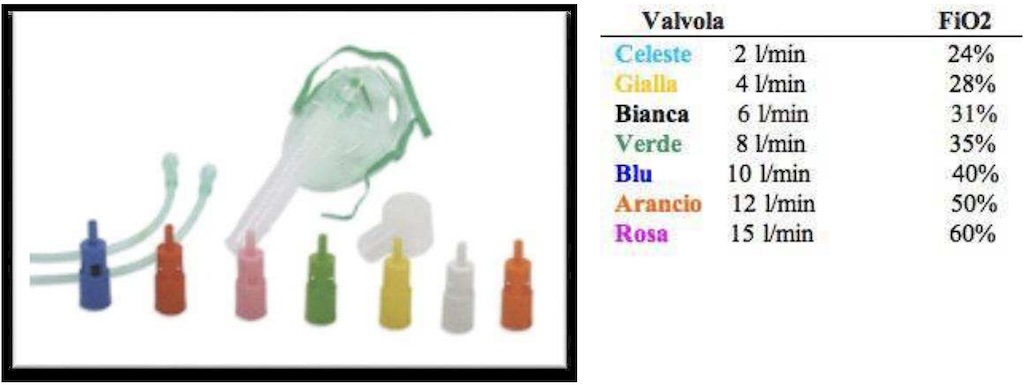 Nella maschera di Venturi i raccordi che hanno l'importante funzione di miscelare l'ossigeno con l'aria e sono tarati con l'aria ambiente che passa attraverso le fessure e hanno riportata l'indicazione del flusso da usare (non meno o di più) a quel flusso indicato ci sarà l'erogazione di aria con O2 alla concentrazione indicata.