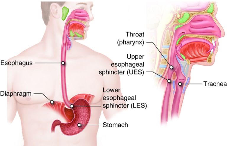 L'esofago inizia dallo sfintere esofageo superiore e scende attraverso il diaframma, oltrepassa lo sfintere esofageo inferiore e raggiunge lo stomaco. Vedere la Figura 5.2 [3] per un'illustrazione di faringe, trachea, esofago e stomaco.